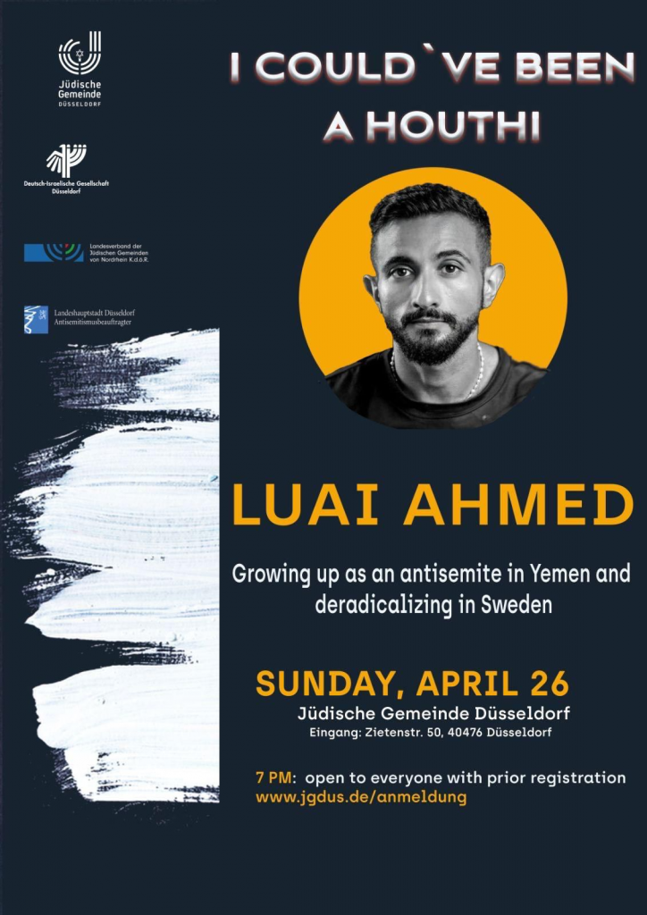 In einem eindrucksvollen Vortrag wird Luai Ahmed berichten, wie er als Antisemit im Jemen aufgewachsen ist und wie sein Weg der Deradikalisierung ihn nach Schweden führte. Luai schildert, wie er im Jemen, in Schulen, Moscheen und im gesellschaftlichen Alltag systematischer Gehirnwäsche ausgesetzt war.